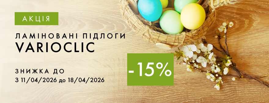 Шановні покупці!З 11.04 до 18.04.26 діє знижка 15% на ламіновані підлоги VarioClic.Ламінат 32 та 33 класу зносостійкості, товщиною 8 мм та 10 мм відмінно підійде як для житлового, так і для офісного приміщення.